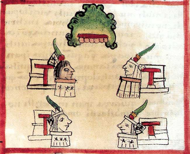 After they had slain them and torn out their hearts, they took them away gently, rolling them down the steps. When they had reached the bottom, they cut off their heads and inserted a rod through them, and they carried the bodies to the houses which they called kalpulko, where they divided them up to eat them. The papers with which they arrayed the images of the mountains, after they had broken them to pieces in order to eat them, they hung in the kalpulko. Many other ceremonies were performed in this feast.”