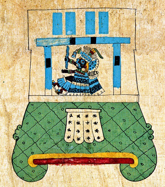 And when it was the time for it, when it was time for them to die, thereupon they set down the litters. Then they were each brought up to the top of the Teokalli; they went leaving each one there at the Teokalli of Tlaloc. And when they had brought them there, then they stretched them on the offering stone. Then the officiating priests, the slayer stood forth. Thereupon they cut open their breasts.”