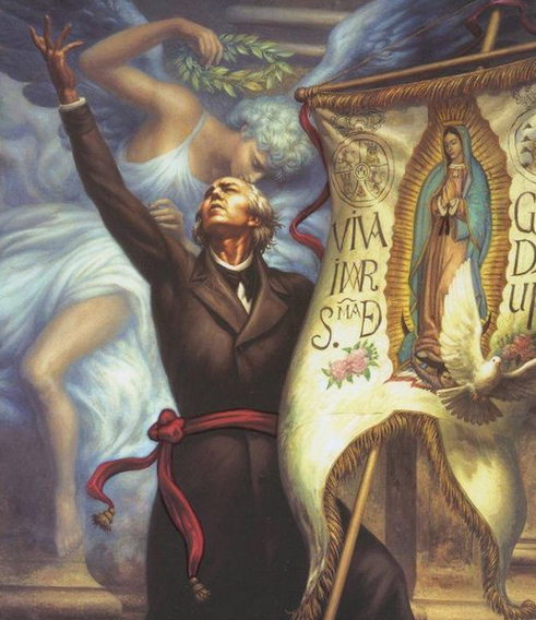 In the eyes of the Creoles, the Virgin of Guadalupe was the perfect nationalistic symbol. Despite their European heritage, the Creoles felt as though they were being treated as second-class citizens by the “pure” Spaniards. Fray Juan de Villa brought this view to the forefront in a sermon delivered on December 26, 1733, when he declared that “As God gave Moses the Law on the mountain, so he gave Zumarraga the image on a hill” (Poole 2004:183). These tensions came to a head on September 16, 1810, when a Creole priest named Miguel Hidalgo de Castillo rallied his fellow Creoles in a struggle for Independence from Spain with his famous “Grito de Dolores,” a call to arms that ended with the words “Long live Our Lady of Guadalupe! Death to bad government! Death to the gachupines!” Ultimately, the Virgin of Guadalupe was effectively made “into a utopic vision for the evangelization and colonization of the Americas, as a way to defeat paganism, to realize a New Jerusalem, and ultimately to endorse the formation of a Mexican nation” (Peterson 2005:610). It was Father Hidalgo’s grito that transformed the Virgin into a national patroness, her image emblazoned across banners and flags during the war for independence as a symbol of creole resistance to Spain.