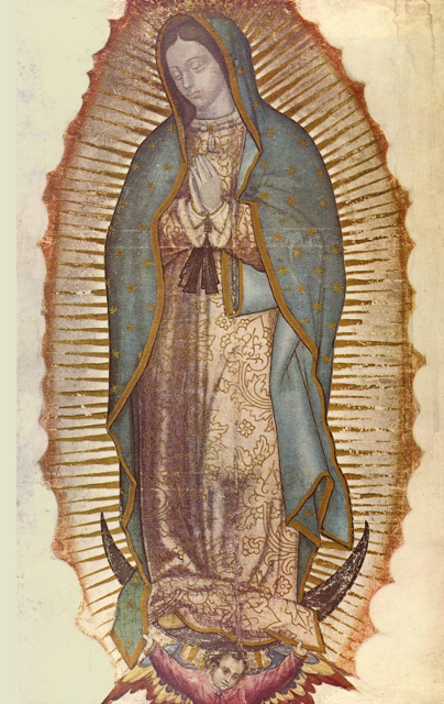 The image of La Virgen de Guadalupe, preserved in the Basilica of Our Lady of Guadalupe in Mexico City, depicts a woman standing atop a crescent moon being supported by a small angel, her blue mantle covered with golden stars. She has a small black band tied around her waist, a common indication that she is pregnant. The image is a graphic representation that Christ is to be “born” again among the peoples of the New World, and is a message as relevant to the “New World” today as it was during the lifetime of Juan Diego.